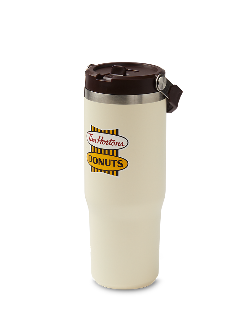 Drinkware never looked more stylish than with the Tim Hortons 30oz Top Handle Tumbler. This understated. sleek stainless steel tumbler comes with a convenient top handle. flip straw. and keeps drinks cold for up to 12 hours. Available in multiple colors. Save $0.10 on refills. offer valid in Canada only. Terms apply. Visit restaurant for details.