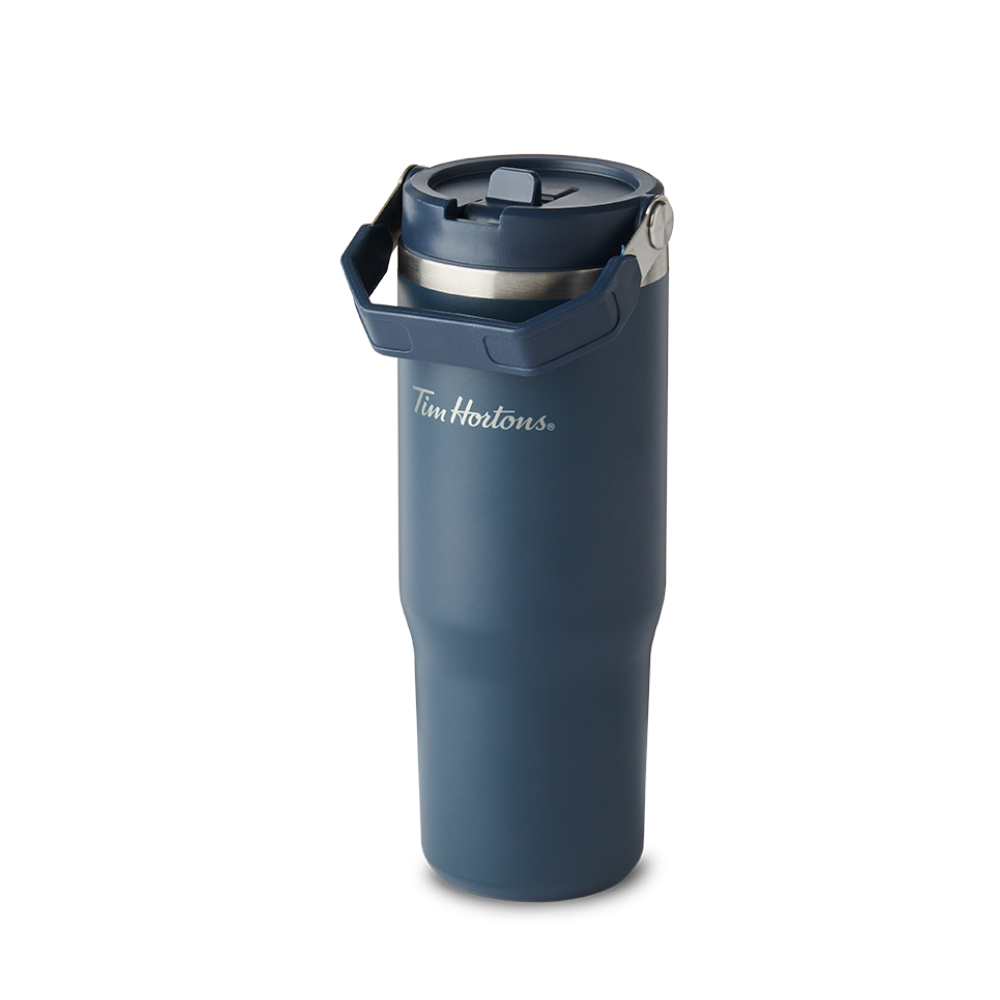 Drinkware never looked more stylish than with the Tim Hortons 30oz Top Handle Tumbler. This understated. sleek stainless steel tumbler comes with a convenient top handle. flip straw. and keeps drinks cold for up to 12 hours. Available in multiple colors. Save $0.10 on refills. offer valid in Canada only. Terms apply. Visit restaurant for details.